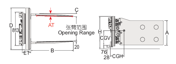 | Capacity 承載能力(kg) | Catalog Order NO 型號 | Mounting Class 安裝等級 | Opening Range張臂范圍(mm) | Arm Height臂高A(mm) | Arm Length臂長B(mm) | Arm Thickness臂厚C(mm) | Overall Height總高H(mm) | Frame Width 框架寬度D(mm) | Arm Toe in內扣量AT(見注5)(mm) | Weight 自重(kg) | Effective 失載距ET(mm) | Horizontal Center of Gravity 水平重心CGH(mm) |