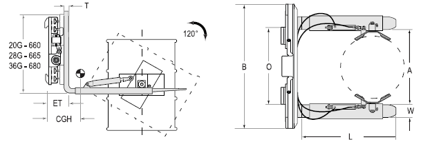 | Capacity 承載能力(kg) | Catalog Order NO 型號(hào) | Mounting Class 安裝等級(jí) | Capacity Load Center on forks承載能力@貨叉載荷中心(kg@mm) | Frame Width 框架寬度B(mm) | Opening Range張臂范圍A(mm) | Fork Size貨叉尺寸LxWxT(mm) | Minimum Truck Carriage Width叉車(chē)貨叉架寬度最小值O(mm) | Weight 自重(kg) | Effective 失載距ET(mm) | Horizontal Center of Gravity 水平重心CGH(mm) |