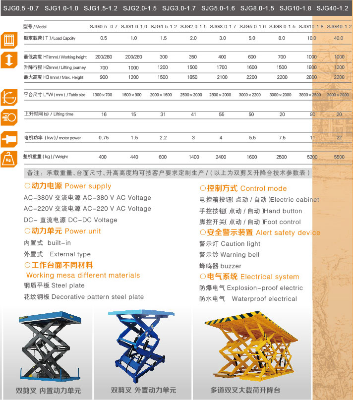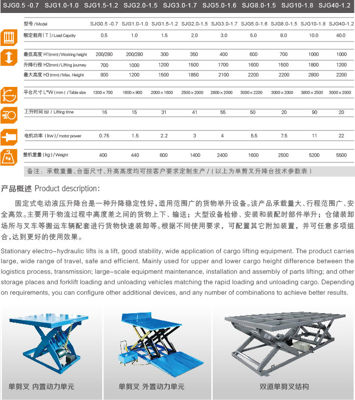 固定式電動液壓升降臺是一種升降穩(wěn)定性好,適用范圍廣的貨物舉升設(shè)備。該產(chǎn)品承載量大、行程范圍廣、安全高效。主要用于物流過程中高度差之間的貨物上下、輸送;大型設(shè)備檢修、安裝和裝配時部件舉升;倉儲裝卸場所與叉車等搬運(yùn)車輛配套進(jìn)行貨物快速裝卸等。根據(jù)不同使用要求,可配置其它附加裝置,并可任意多項組合,達(dá)到更好的使用效果。